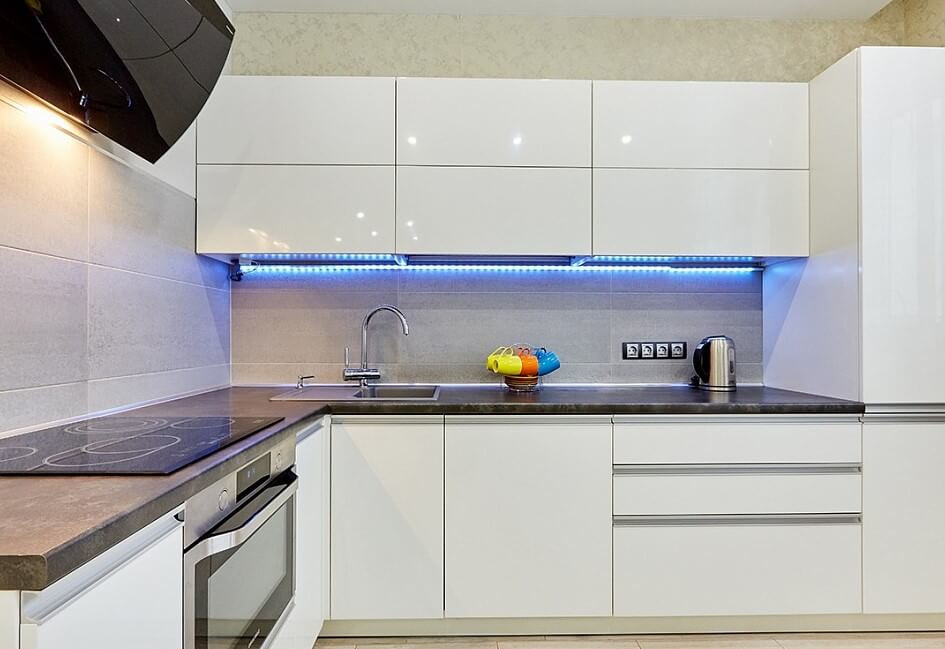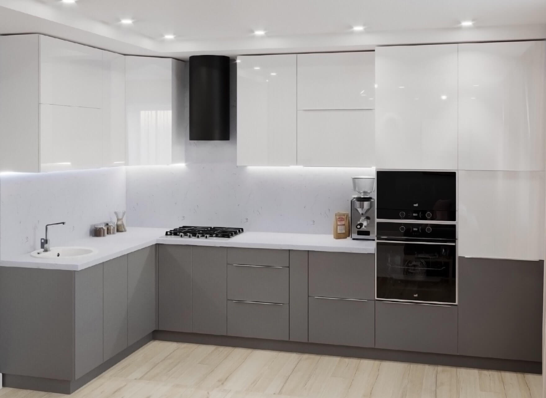 Стоимость складывается из следующих факторов: размер кухонного гарнитура, количество верхних и нижних шкафов, материал корпуса (ДСП, ЛДСП, фанера), сложность и материал фасадов (МДФ, пластик, шпон, эмаль), наличие или отсутствие встраиваемой техники, материал столешницы (пластик, акрил, натуральный камень), качество фурнитуры и ее производитель.